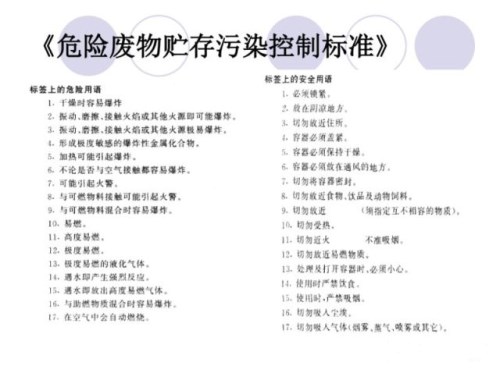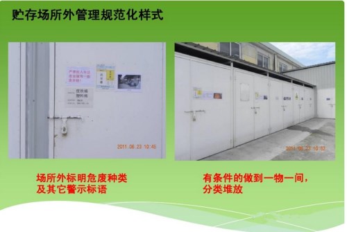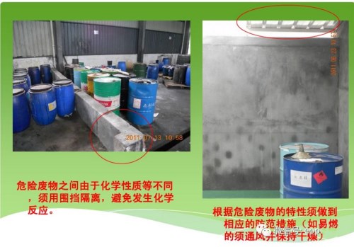 4.不同种类危险废物应有明显的过道划分,墙上张贴危废名称,液态危废需将成装容器放至防泄漏托盘内并在容器粘贴危险废物标签,固态危废包装需完好无破损并系挂危险废物标签,并安要求填写。